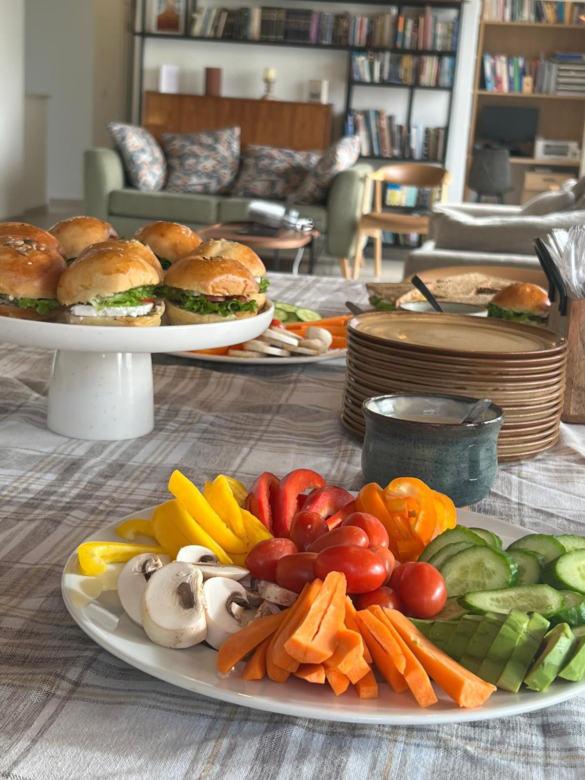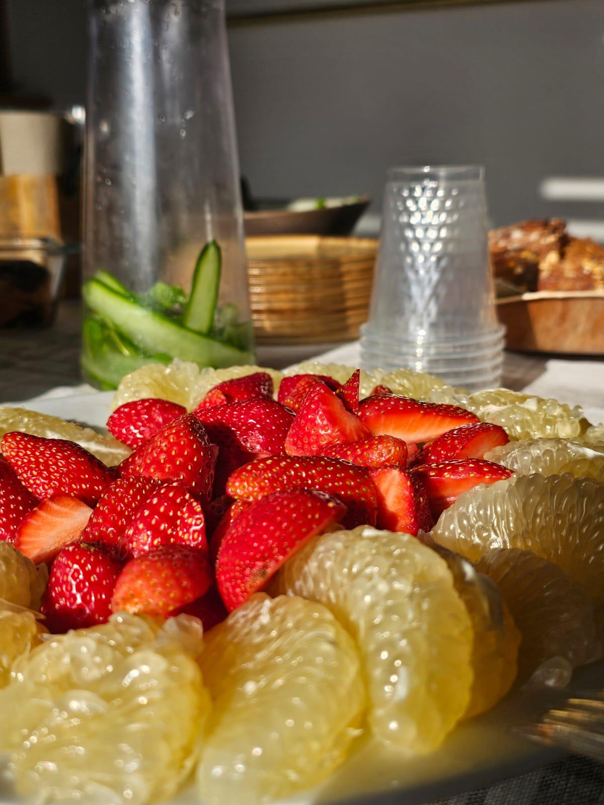ארוחת בוקר מפנקת עם כריכים וירקות טריים, פינת קפה עם עוגות ופירות לאורך כל היום.